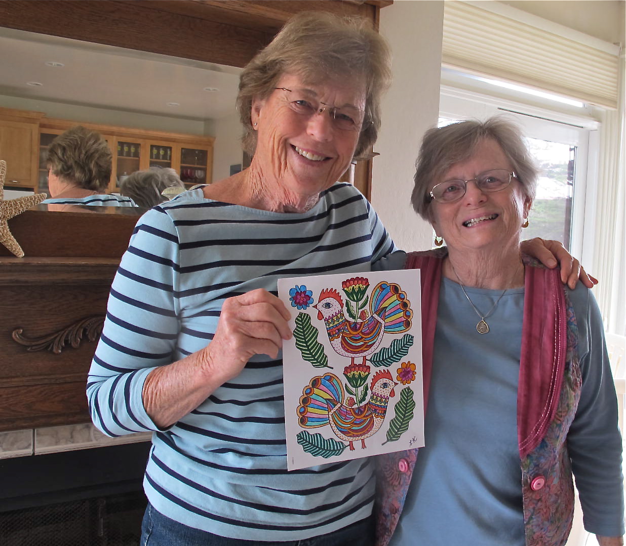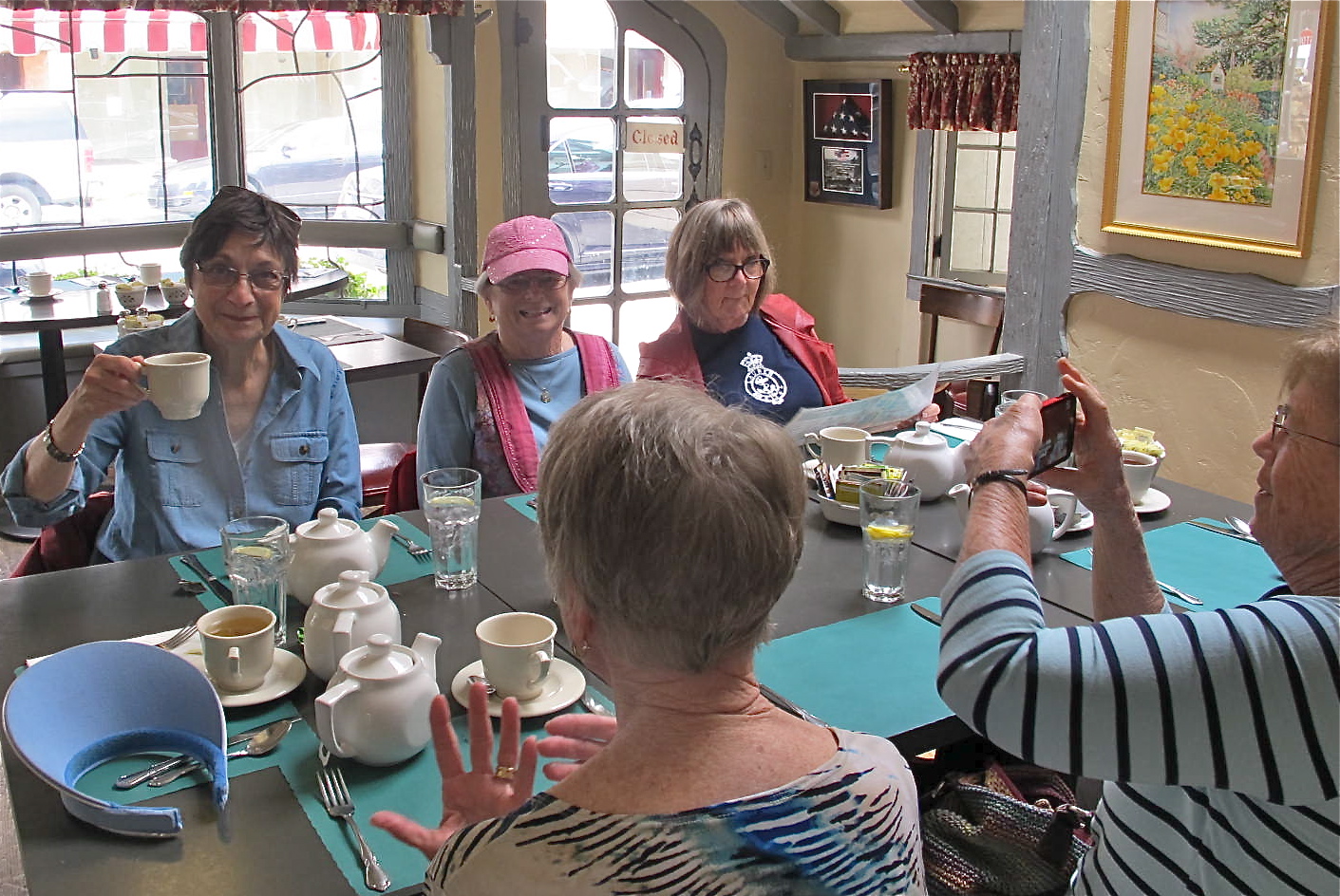 Thanks, Sherry, for the salute with the teacup. I note in this picture that Trish is talking with her hands again. She’s good at that and doesn’t knock things on the floor as I would with the hand motions. 🙂