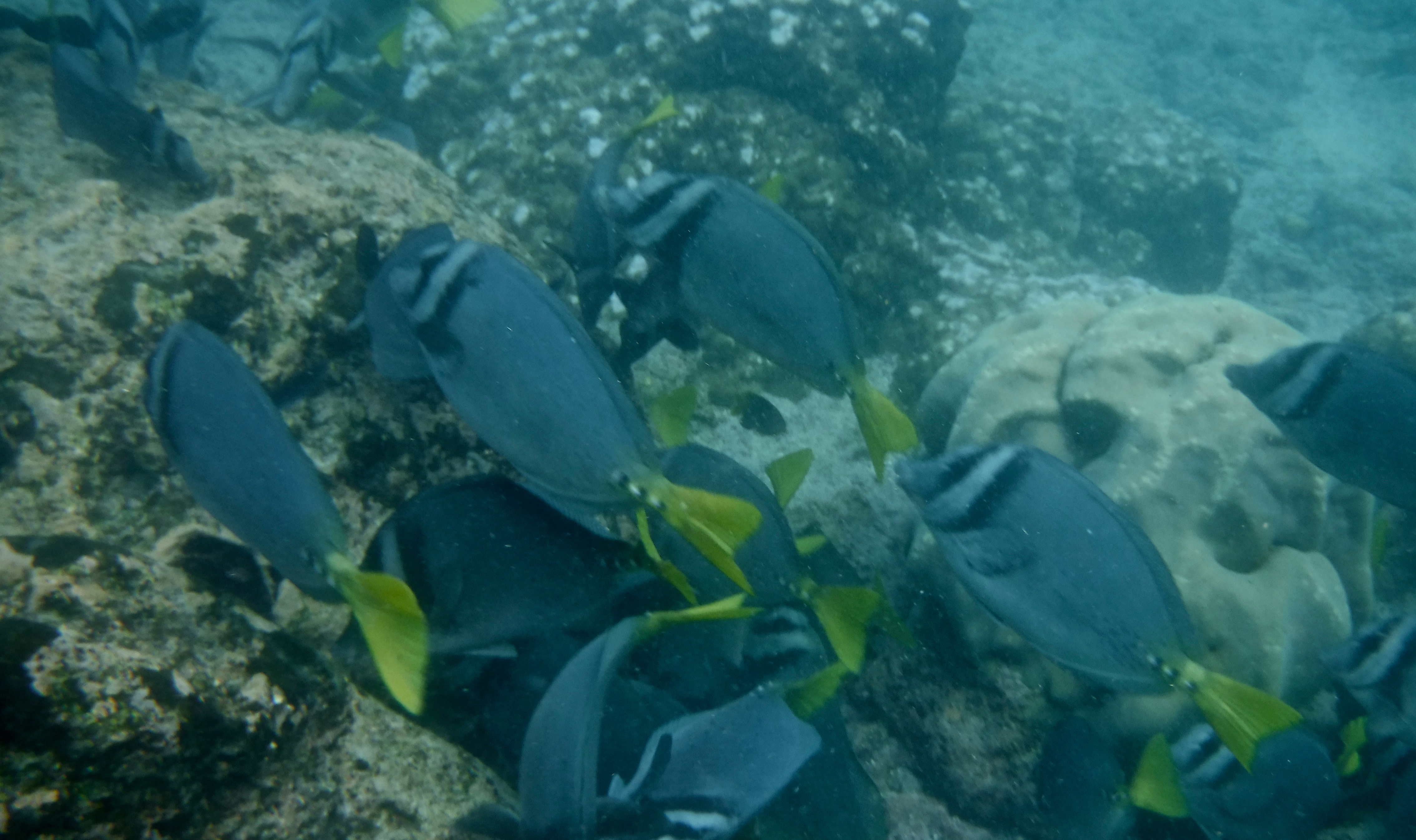 We left Suarez Point and sailed to Gardiner Bay, on the eastern side of the island. This was our last chance to snorkel and see some fun animals. Pato took us into a cove where we were greatly entertained by sea lion pups. They were learning how to fish were often successful. One guy would take his catch up on the rocks and proceed to whack the poor fish on the rocks. Then he would eat it. Perhaps he was tenderizing it. Who knows?