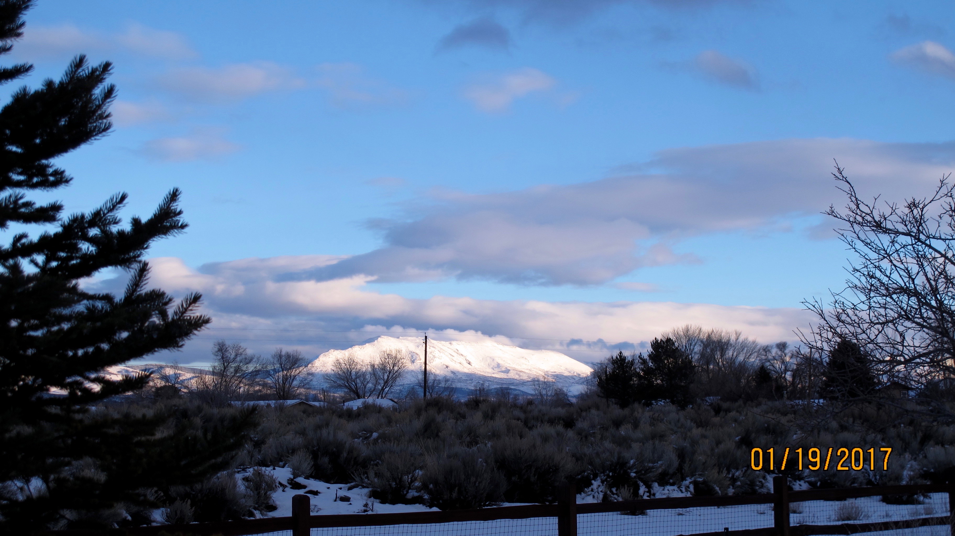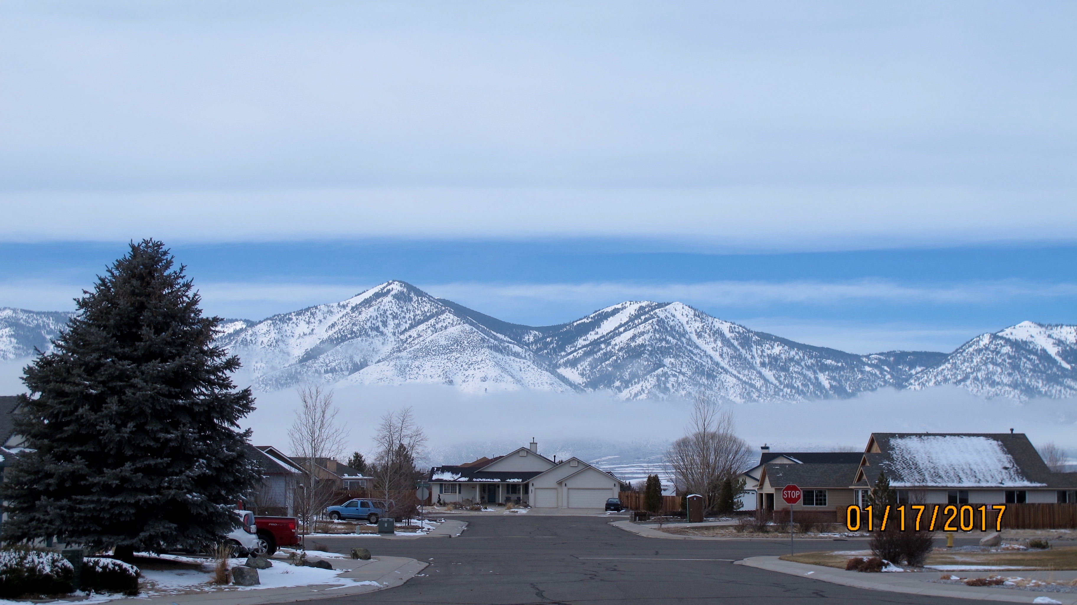 I turned just a little bit and took this photo of Kingsbury Grade, our primary road to Lake Tahoe. You can see the long cut leaving the valley (center left) and then another cut as it reaches the summit. There are some buildings at the top left that belong to the Heavenly ski Resort. Some ski runs are to the left, out of the picture.