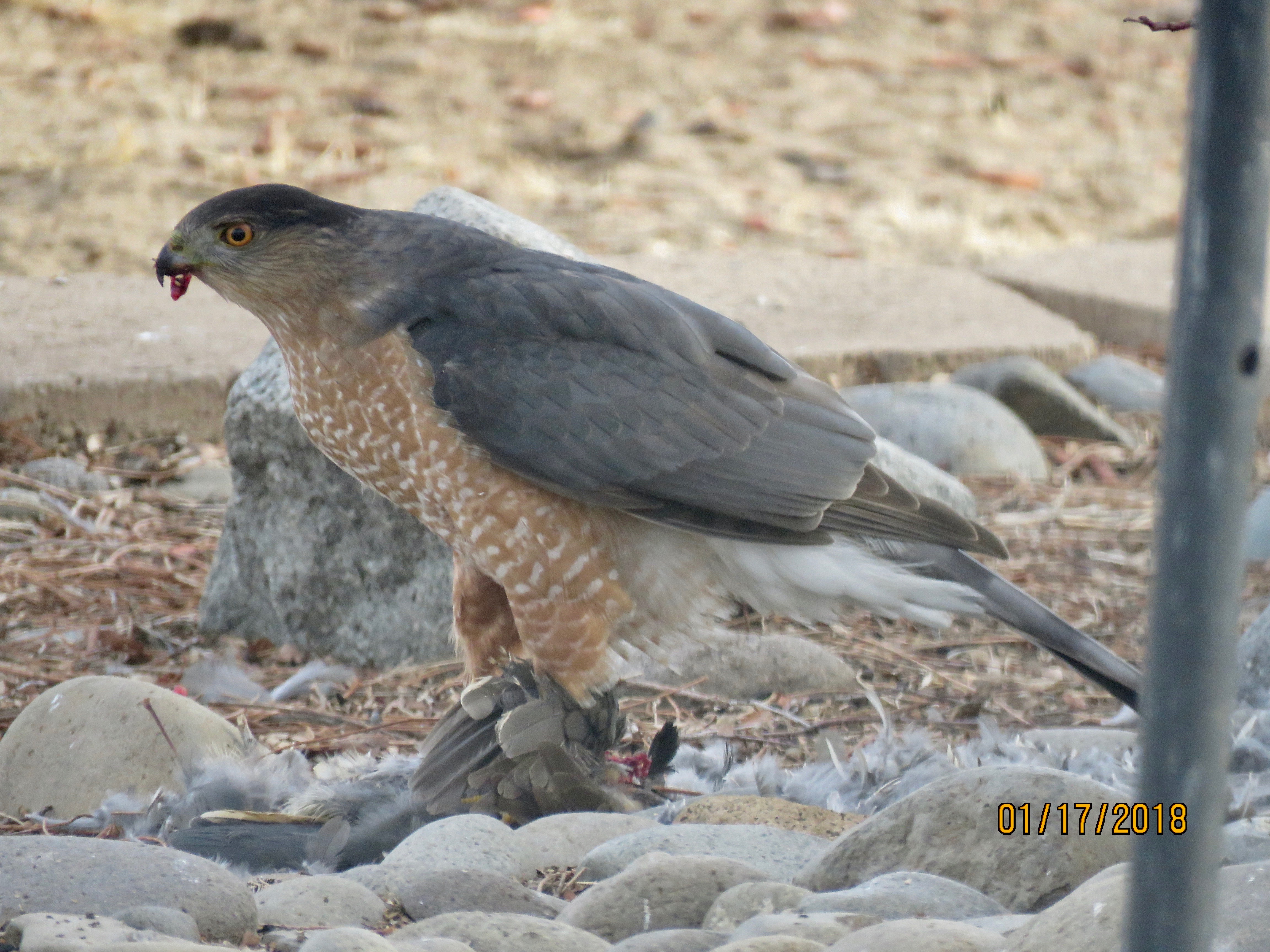 As you can see, life goes on in the Carson Valley with a lot of birthin’ and, sometimes the opposite. I came home a couple of days ago and looked out in back to see this Cooper’s hawk with a kill. I took a bunch of pictures and then did some other tasks. When I looked out about half an hour later, there was nothing left on the ground except feathers. I don’t know if he ate it all or flew away with part of it.
