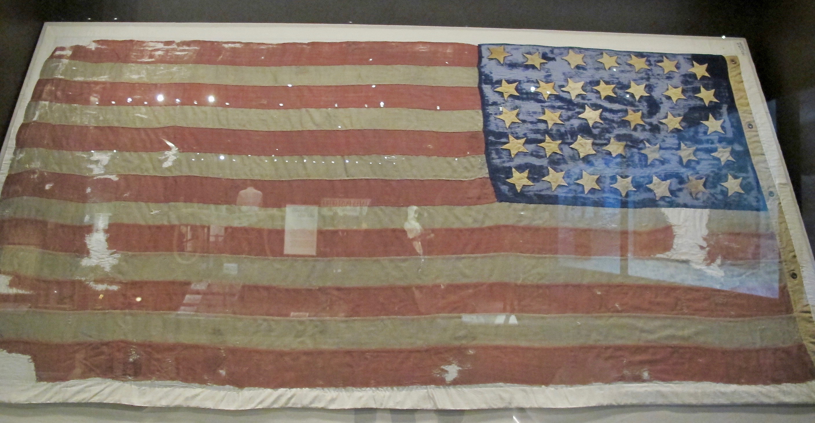 This 35 star flag because it was carried in 1862 by the 1st Regiment of Colorado Volunteers. It is displayed in a backward manner because to remove the backing would have destroyed the remaining fragments of the remaining fabric. The flag was torn by Confederate grapeshot during a battle at Glorietta Pass. Nevada became a state in 1864. Thus, giving the U.S. flag 36 stars.