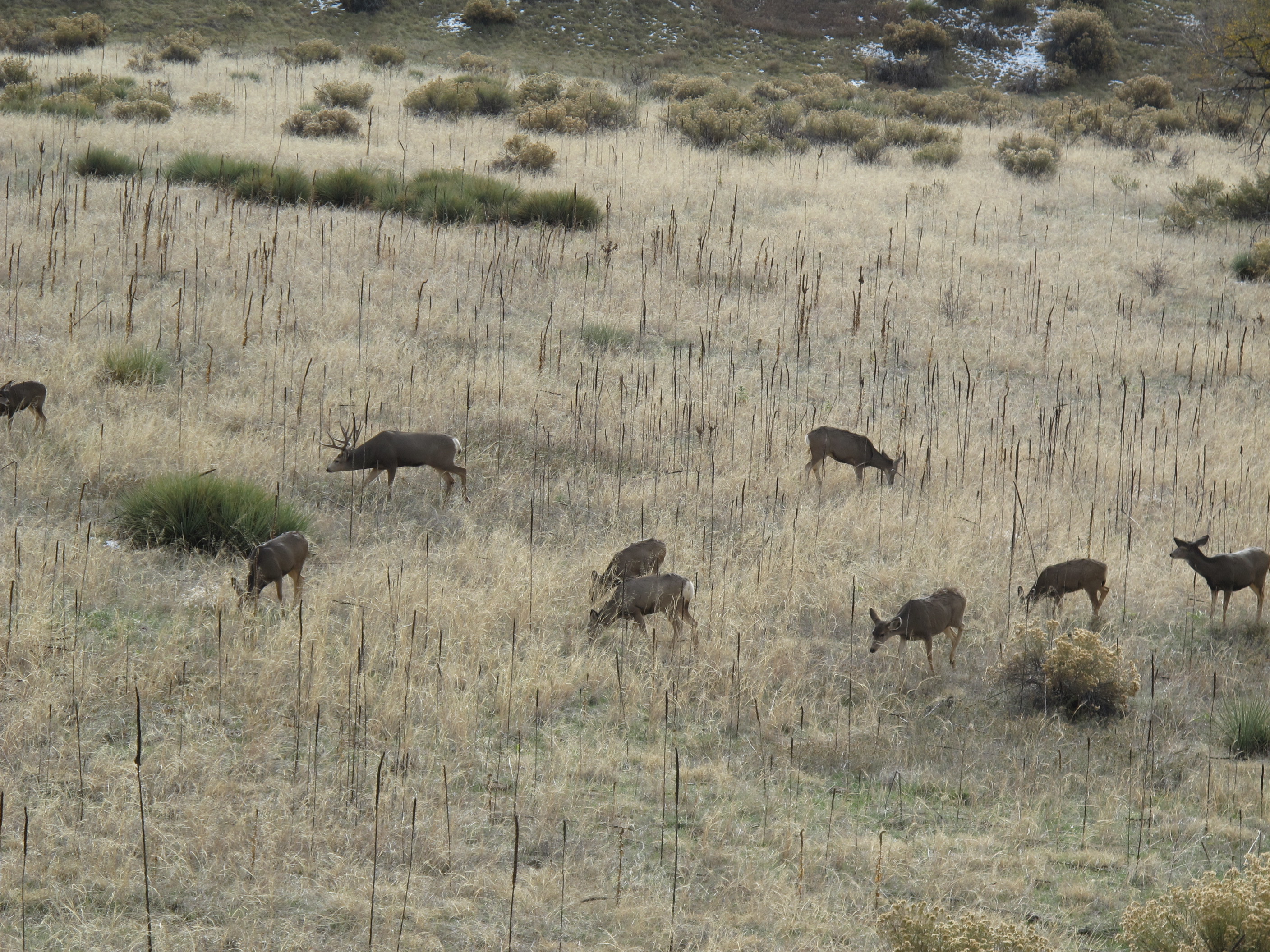 The next morning a stag with his does (a harem?) were in the same area where the snow picture was. Uncle Bev and Nancy told us they have seen does give birth in the same area.