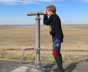 We drove around a designated road and were able to get out to walk up Rattlesnake Hill. Jerri is using the telescope to espy a distant herd of bison. Check out how flat the prairie is in the background. It goes on for miles!
