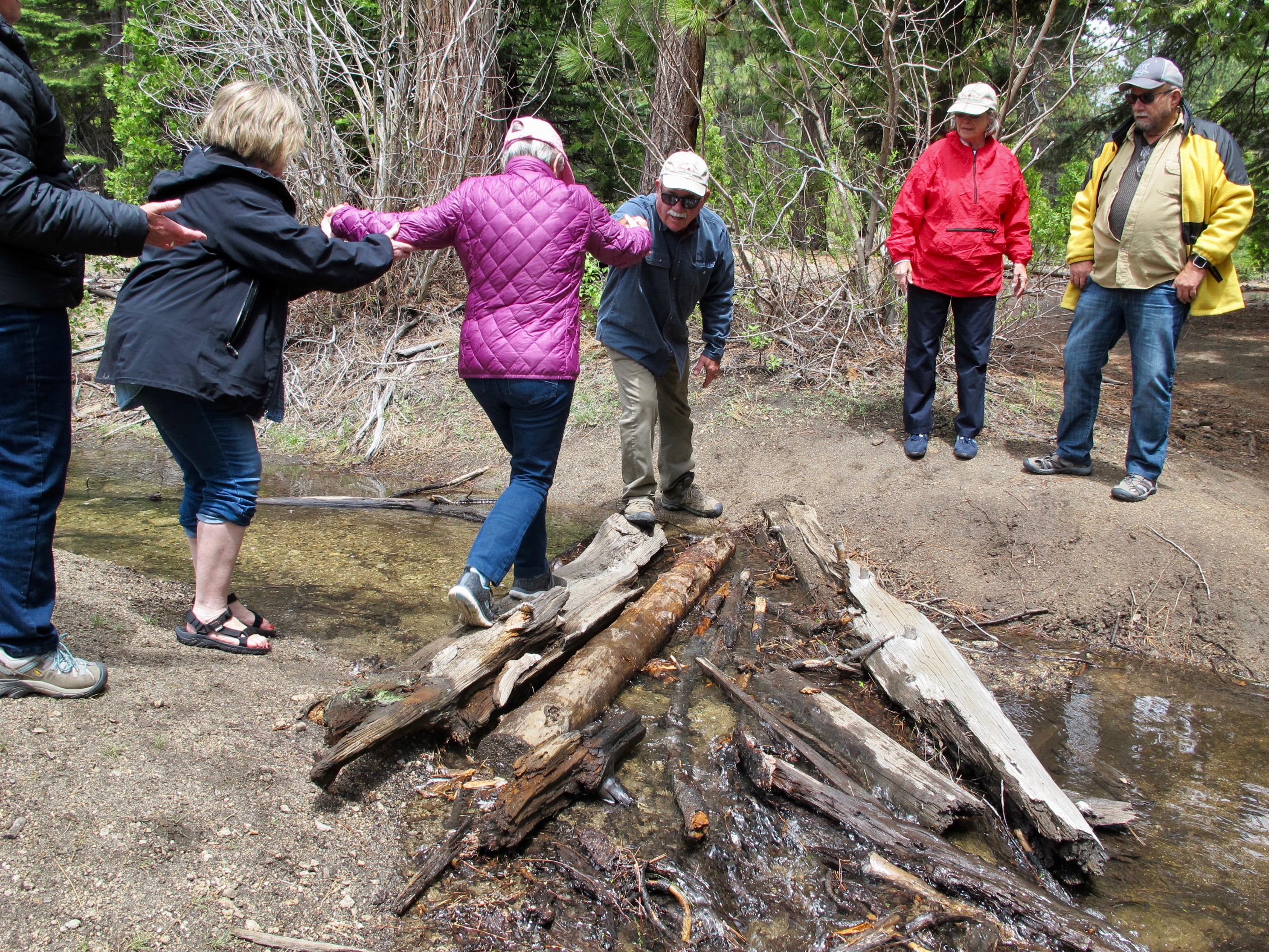The calm creek became deeper and we had to ford it with the help of many people. It was too cold to run around with wet feet. That is, except Mike, who rolled up her pants and waded across one time. The rest of us were chicken.
