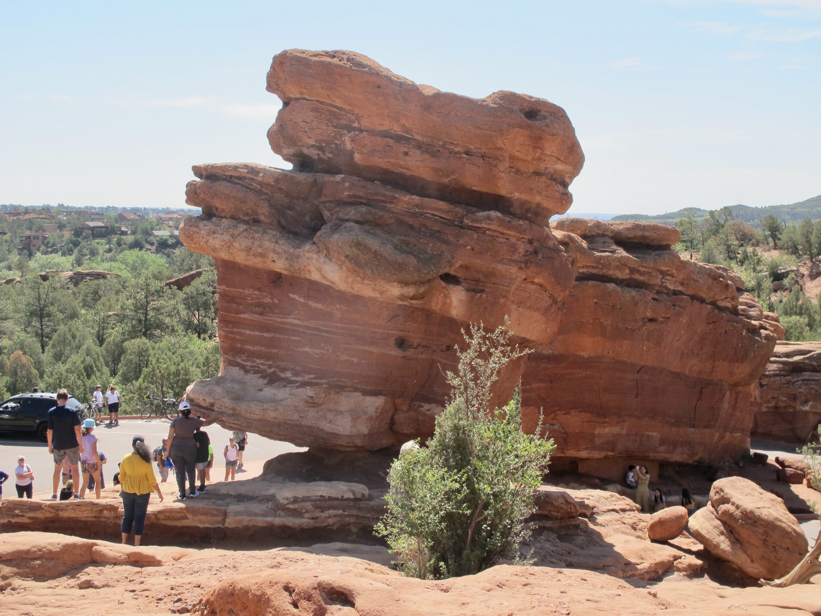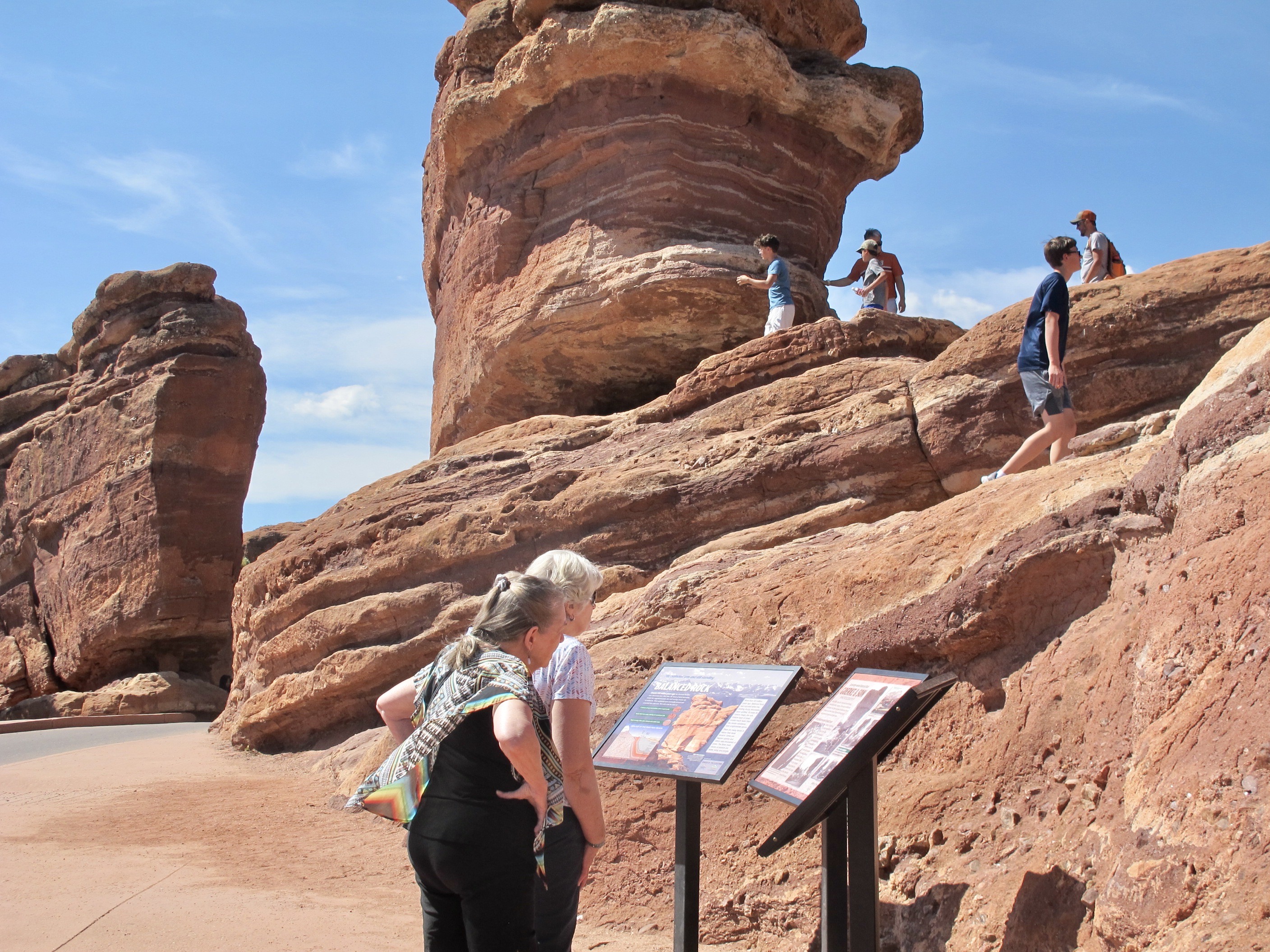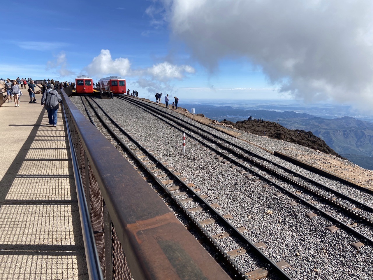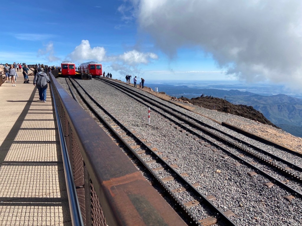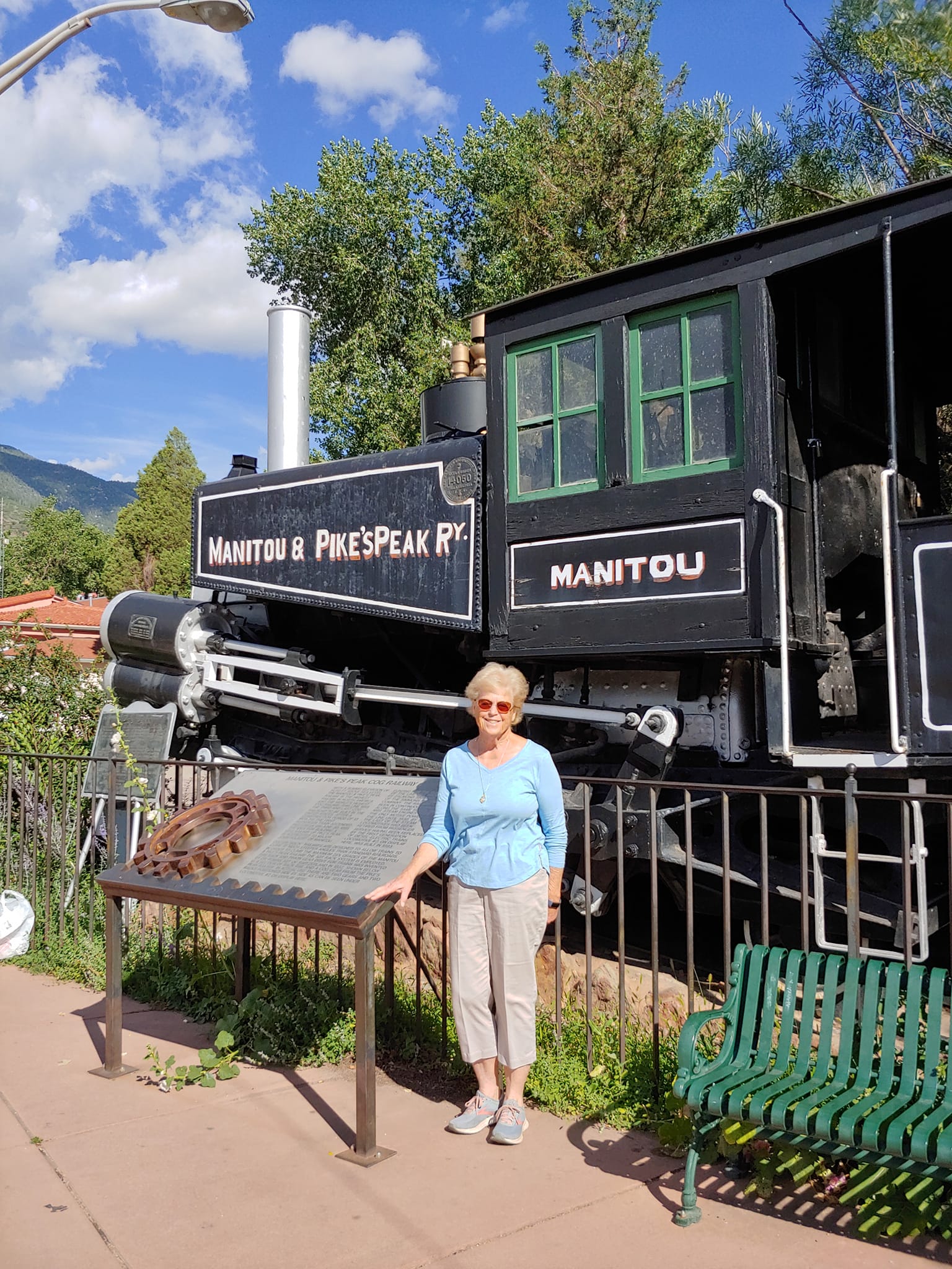 The Allison House with its entrance bridge over Fountain CreekFountain Cree runs through Manitou and ends up being in confluence with the Arkansas River.The locked mystery door in the retaining wall in back of the house. There is a small mountain directly in back of and above the wall, so the door must lead into a storeroom of some sort. Storage for roots, canned goods, guns, people, loot from robberies??? We had many scenarios.Our dinner guestWe were within walking distance of the main street where many cool shops are, and these are just a couple of them. So many things to take home.Lynda discovered this little coffee shopElizabeth and I joined her one afternoon and enjoyed the Appalachian music playing in the backgroundLynda in front of an old engine on the Cog Railway. Cogs had to be used to help the engine take passengers up to the summit of Pikes Peak (14,115’), the highest of any cog railway in the world. Some of the grades were 25%. The steepest cog railway is the Pilatus in Switzerland at 48%! A regular train’s maximum grade is 2.2%.The funny looking thing between the tracks is the cog. (Click on the photo to see them better). This is at the summit of Pikes Peak (Since 1890 Pikes Peak has officially been spelled without the possessive apostrophe. The U.S. Board of Geographic Names has removed nearly all apostrophes from place names for uniformity and ease of signage.). The red things at the end are the new cog railway engines/passenger cars.Elizabeth had never been to the Garden of the Gods and we definitely had to remedy that.Pikes Peak in the far background. That faint line going diagonally up a nearer mountain is the mile-long Manitou Incline, a series of steps going up a VERY steep incline. People run up this trail. We didn’t. 🙂Checking out the Balanced Rock along with many other people. Parking was hard to find.One wonders how it has stayed balanced for so many years.