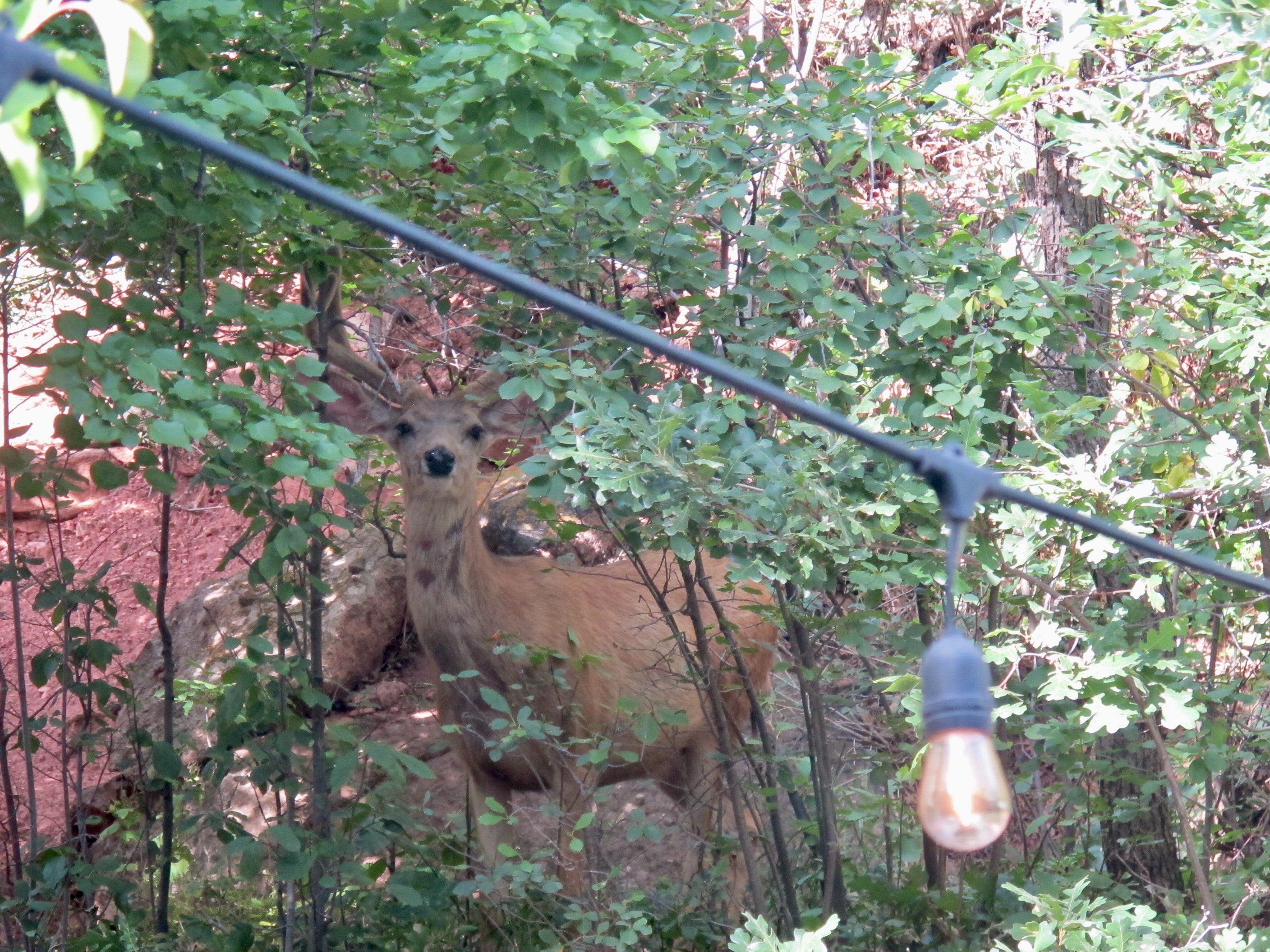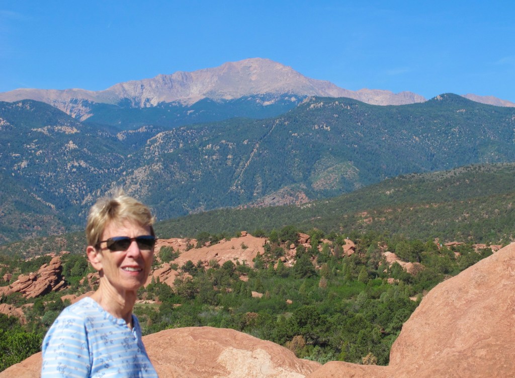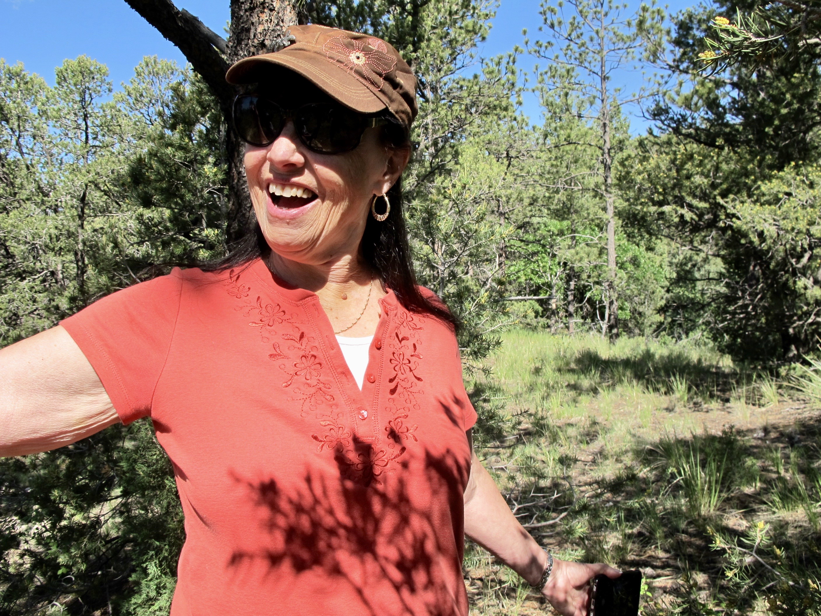 Wednesday, we had our Zoom call with those who were not able to join us. That was quite a feat to get the room dark enough for the almost right ambiance. Thank goodness Alan was there to help. The ladder was in the background so as to hang a comforter over the window so that we wouldn’t be silhouetted by the sun.The ZoomersThe Manitou Springs attendeesThe afternoon following the Zoom, we went to a tea party…except no tea was served. Our friend, Connie, had prepared an exquisite repast of meatballs, salmon, salad, shrimp cocktail, other tasty treats and last, but certainly not least, wine. Again, we were all having so much fun with many conversations going that we have no photos of said party. Maybe that’s good? No, I’m sorry we have none as it certainly was fun. Adding to the excitement was a nearby thunder storm that not only displayed some vibrant lightning but several sharp claps that were a bit nerve wracking. This photo displays some of Connie’s enthusiasm on a hike a couple of years ago.