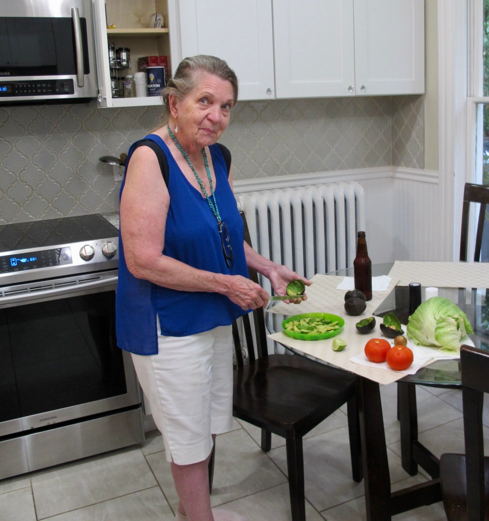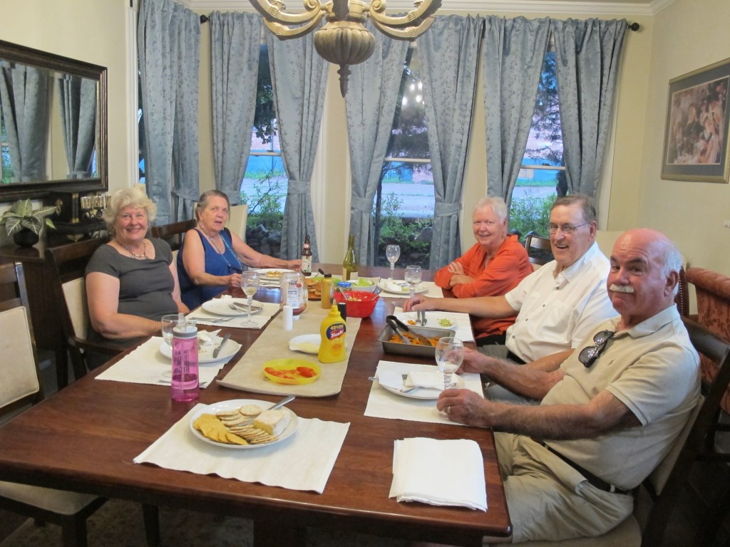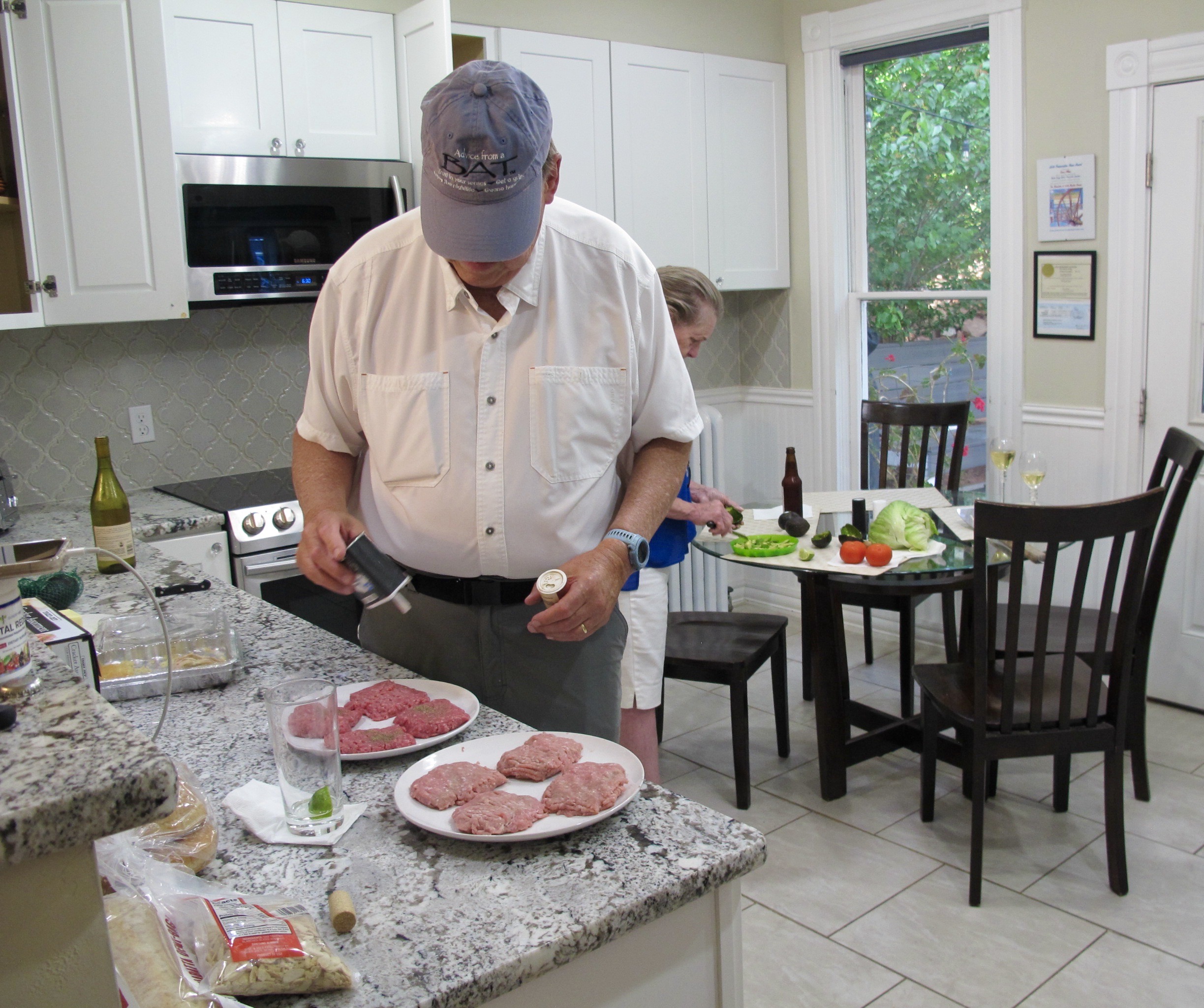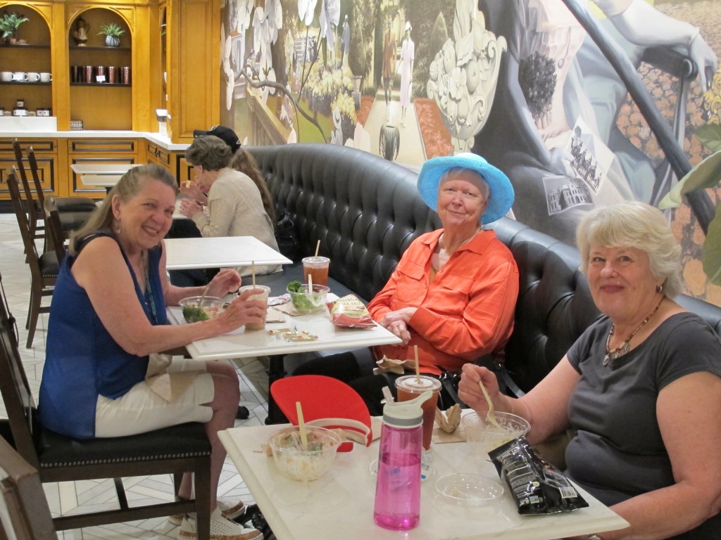 Elizabeth, Diana, Shoo and I went to the Broadmoor, a destination resort for lunch and to walk around the grounds. It is fun to walk in the buildings and see a lot of art and some local history. Lunch at Cafè Julie’s.Founder Spencer Penrose’s wife, Julie, and an early Broadmoor painting.One of the Broadmoor’s wings beside the lake. We saw some good sized fish in this small lakeThat evening, Alan and Jack joined us for our last night’s dinner. Alan helped prepare dinner.Elizabeth prepared condiments and her daily avocados.While having hors d’oeuvres on the back deck, it began to rain and poor Jack cooked the burgers while it was pouring. We enjoyed our repast inside and had some wonderful little cakes Jack had picked up at the local bakery.