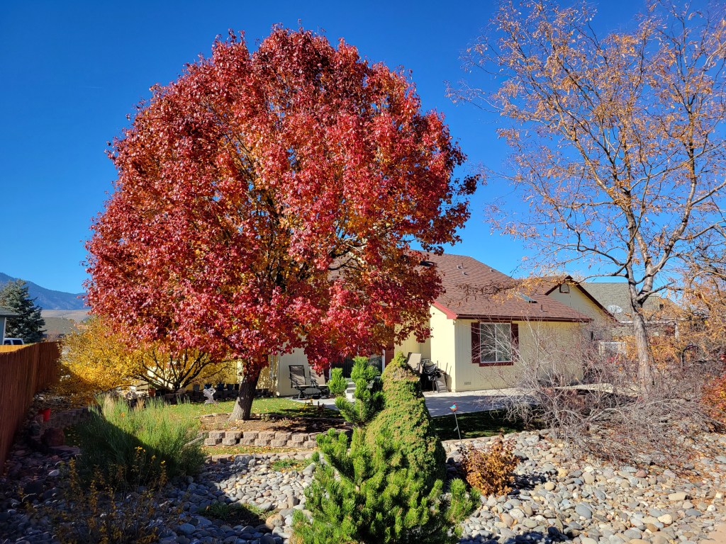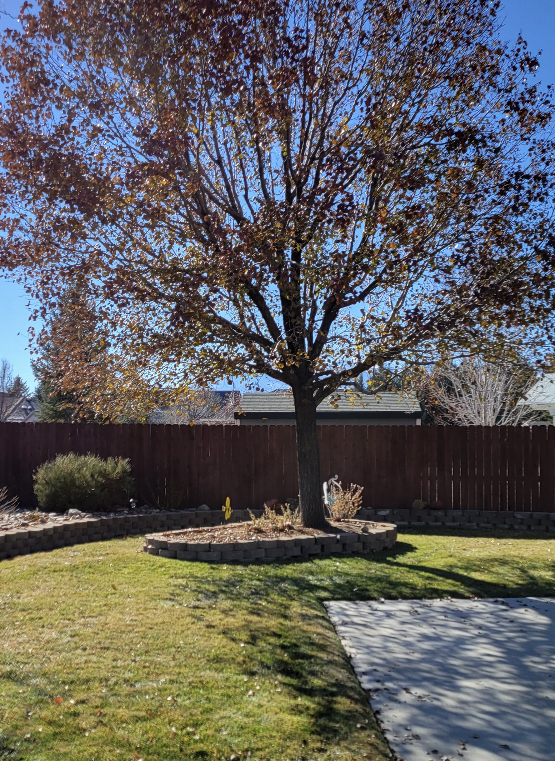 It is very green in the summer and provides a lot of shade…then fall arrives with the changing of colors. Still, it is a beautiful tree, still providing shade.