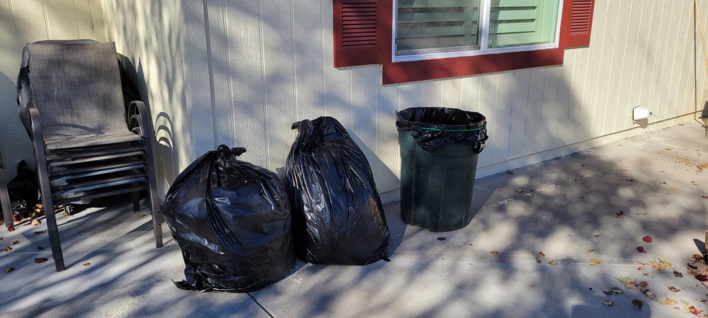 Two and 3/4 trash bags stomped on and crushed to make more room in the bags. The trash barrel was filled as I went around the corner where more leaves had secreted themselves.