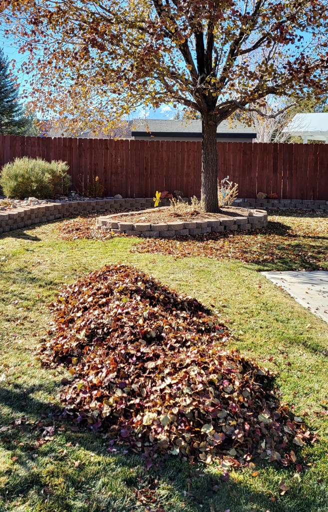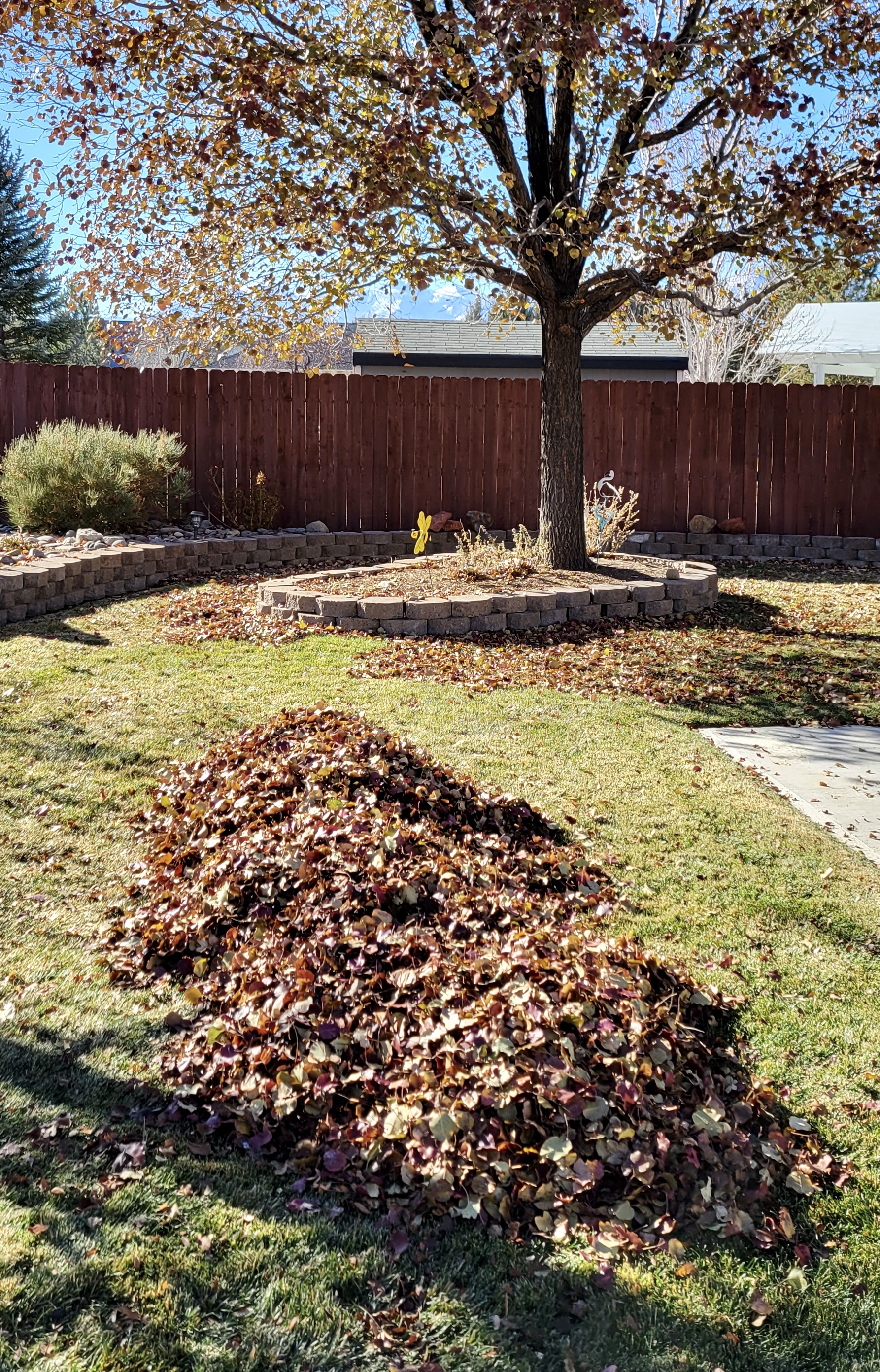 Frosts happen and then 40 to 60 mph winds blast the poor tree, causing it to lose many of its leaves. A thick carpet of leaves coats the lawn to the point of not being able to see the lawn. Finally, it was warm enough to get out to begin the raking.